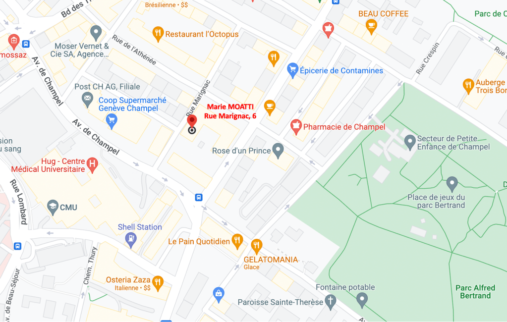 - lignes RE, S , SL1, SL2, SL3 – arrêt GENÈVE-CHAMPEL (à 350 m du cabinet)
